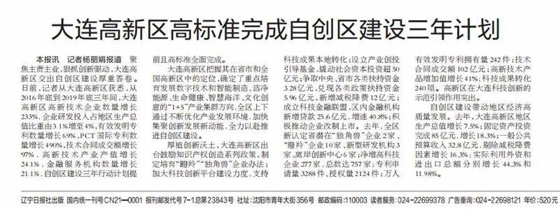 本报讯 记者杨丽娟报道 聚焦主责主业,狠抓创新驱动,大连高新区交出自创区建设厚重答卷。日前,记者从大连高新区获悉,从2016年底到2019年底三年间,大连高新区高新技术企业数量增长233%,企业研发投入占地区生产总值比重由3.1%增至4%,有效发明专利数量增长69%,PCT国际专利数量增长490%,技术合同成交额增长97%,高新技术产业产值增长24.1%,金融服务机构数量增长21.1%,自创区建设三年行动计划提前且高标准全面完成。