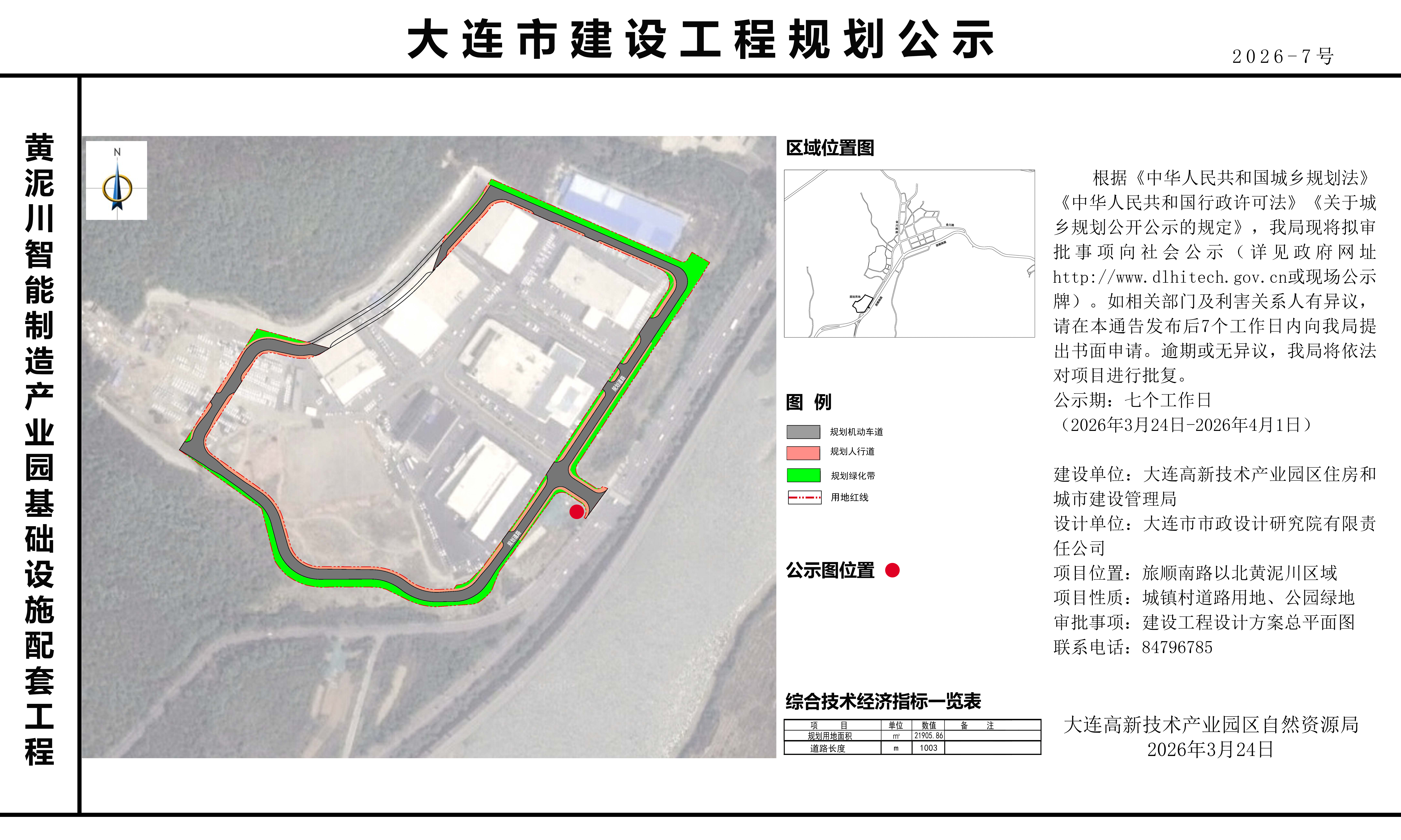 根据《中华人民共和国城乡规划法》《中华人民共和国行政许可法》《关于城乡规划公开公示的规定》,我局现将拟审批事项向社会公示(详见政府网址http://www.dlhitech.gov.cn或现场公示牌)。如相关部门及利害关系人有异议,请在本通告发布后7个工作日内向我局提出书面申请。逾期或无异议,我局将依法对项目进行批复。
